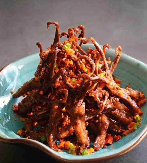 鴨舌加蔥薑料酒和鹽以及陳皮煮熟,過油炸至香脆撈出