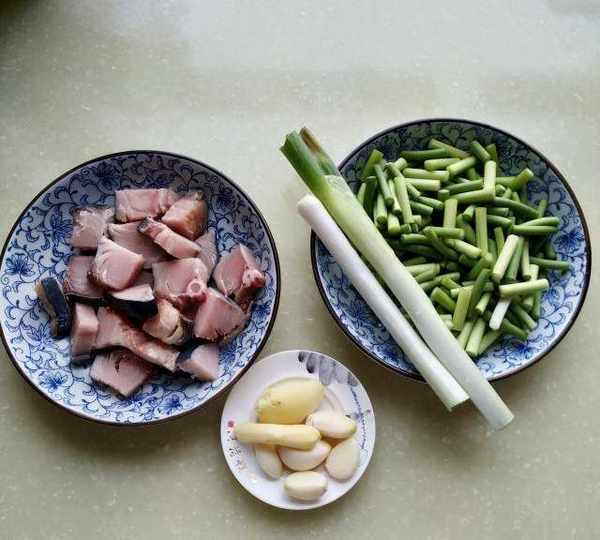 第1步、鮁魚一塊洗幹凈,蒜苔洗凈切長段,蔥薑蒜準備好。
