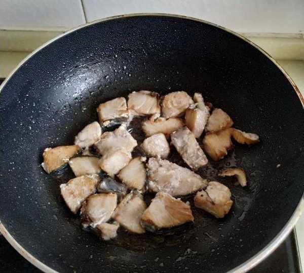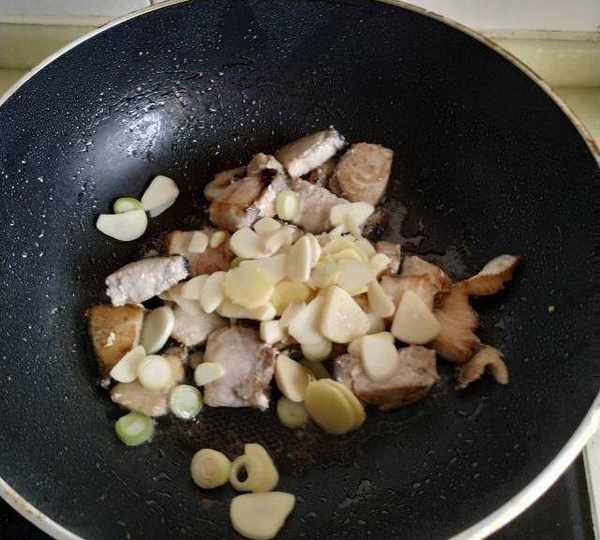 第4步、如果有五花肉最好現在放入,忘瞭買,直接放蔥薑蒜和鮁魚一起炒香。