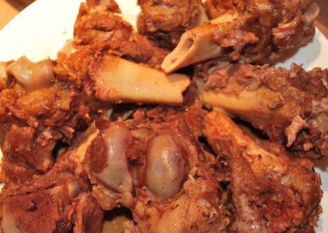 炒鍋上火放50克菜油,稍熱後炒黃豆醬,炒香炒勻後,倒入鍋中,加雞湯、香辛料包、豬油、生抽、白酒、冰糖、鹽、胡椒、雞精、味精、蔥薑蒜等,大火燒開,煮半小時,醬大骨的湯就好瞭,這時可以把處理好的大骨放入鹵湯中,鹵3小時就好瞭。