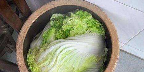然後我在醃制酸菜之前需要把白菜曬三天左右,這樣做的目的就是讓白菜把多餘的水分曬出來,制作的時候就不容易腐爛瞭,曬幹之後鍋裡面加水燒熱,把白菜放進鍋裡面焯水5分鐘撈出來晾幹水分。其實醃制酸菜也是有講究的,很多人都是用自來水醃制,但其實如果用淘米水醃制的話效果就會更好,因為淘米水裡面有一些足夠酸菜發酵的食物還能夠大大縮短醃制時間,而且用淘米水醃制的酸菜吃起來會有一種氨基酸。這也是有很多好處的,不用淘米水的話,可以用山泉水或者是純凈水來代替,千萬不要直接用涼水哦。
