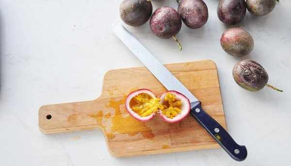 2 百香果對半切開,千萬不要在大理石臺面上切百香果,我是墊著菜板,但是汁不小心弄到大理上,就被腐蝕瞭,上面的亮光沒有瞭,一片百香果汁的印子。