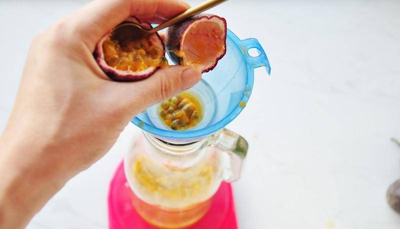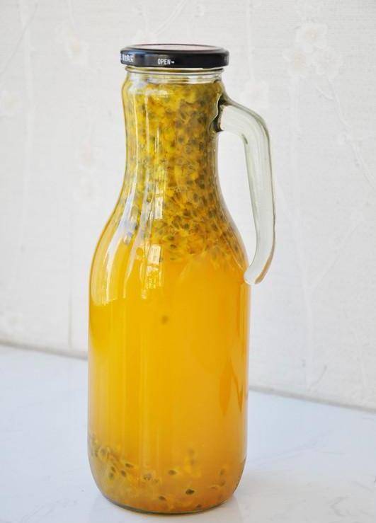 3 百香果汁用勺子挖出來放瓶子裡,一共500克,我試瞭250克和500克兩種配方,我覺得還是500克味道更濃更好喝,喜歡淡的可以減量。