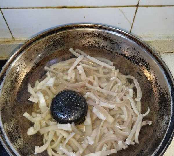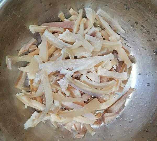 第1步、豬皮用冷水浸泡30鐘,洗凈。放入鍋中涼水煮開,待肉片顏色變深後撈出放入涼水中洗凈。