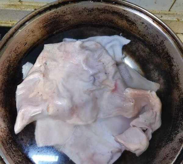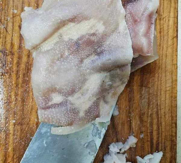 第2步、用刀剔除油脂,去豬皮上的毛。再重復一遍下鍋煮,涼水洗,剔除油脂的操作。