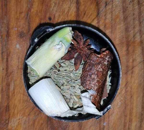 第4步、將蔥段、薑片、八角、桂皮、小茴香放入調料盒中。