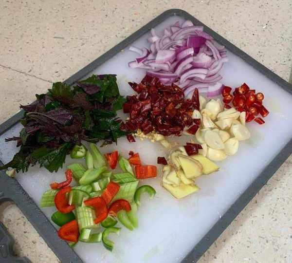 第2步、蒜頭,薑片,紫蘇,洋蔥,青紅辣椒,芹菜,洗幹凈切好備用。