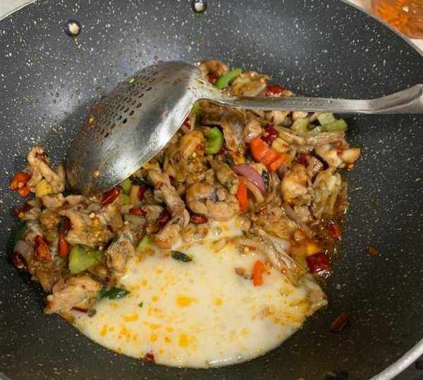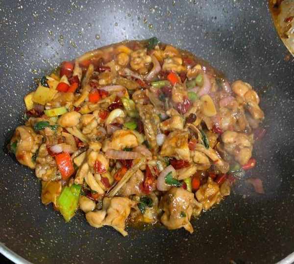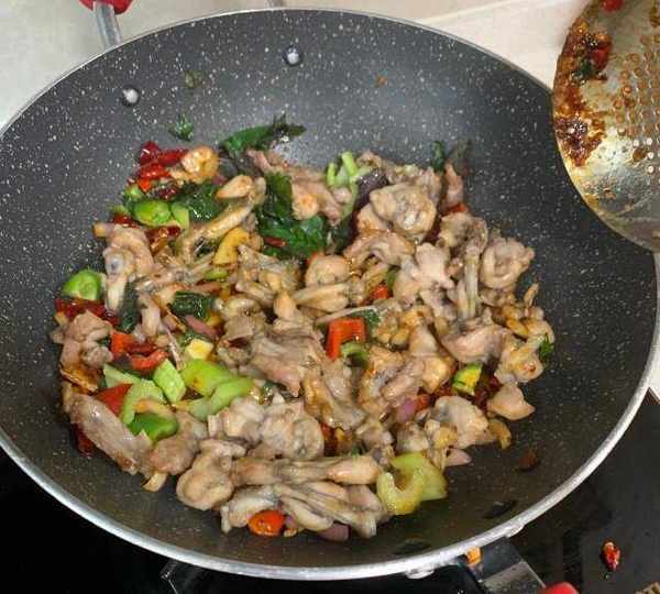 第7步、放入炸好的牛蛙,紫蘇,青紅辣椒,繼續爆香,大概15秒。