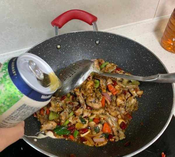第8步、倒入大概200g的啤酒,加入少許醬油,糖,蠔油調味。口味根據自己愛好調整哦!