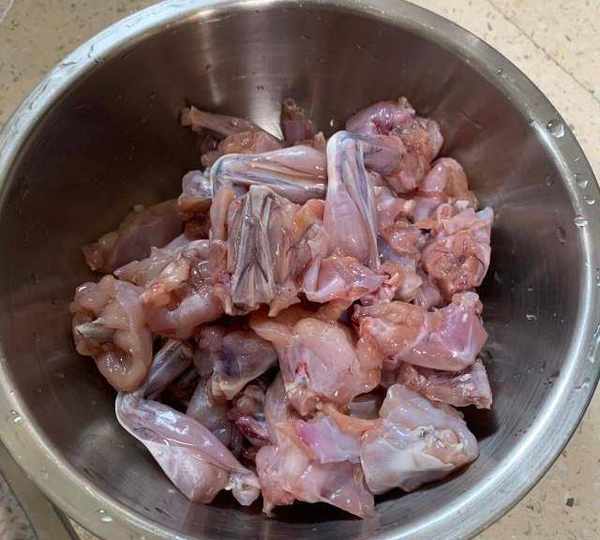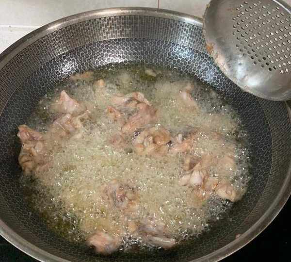第3步、醃制好的牛蛙,熱油炸至七成熟。撈出來備用。