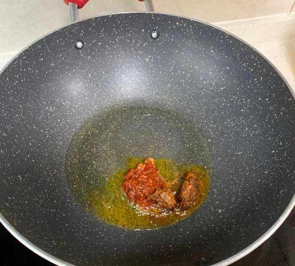 第5步、放入豆瓣醬,火鍋底料爆香。