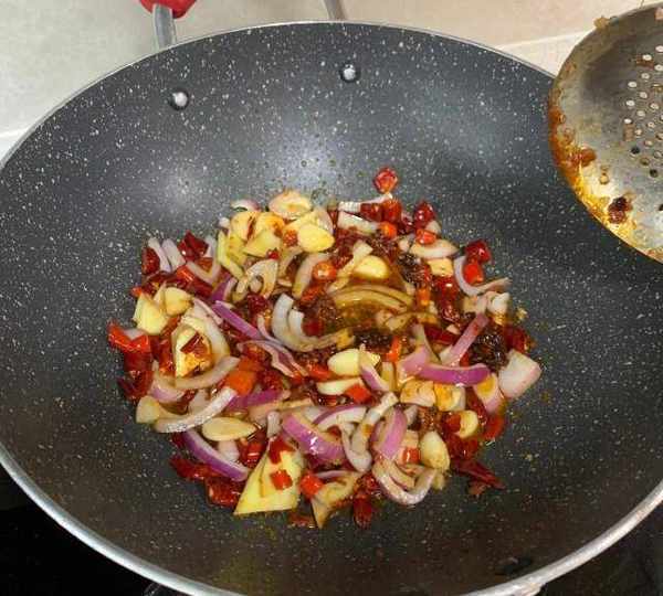第6步、放入薑片,蒜片,指天椒,幹紅辣椒炒香,再放入洋蔥繼續爆香。