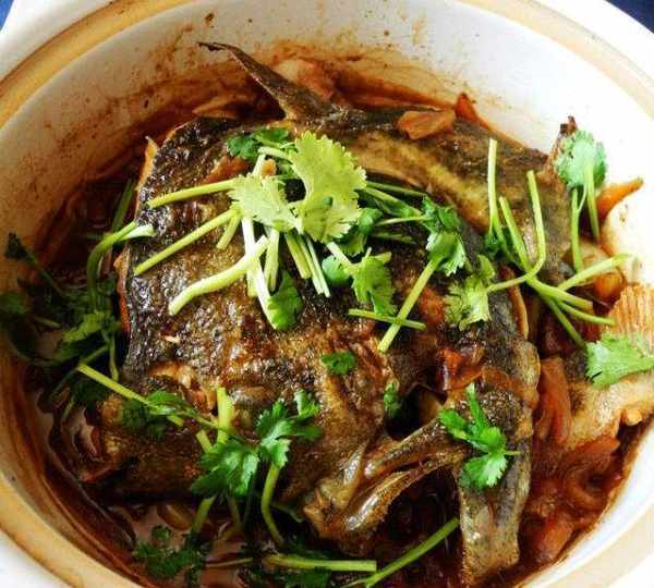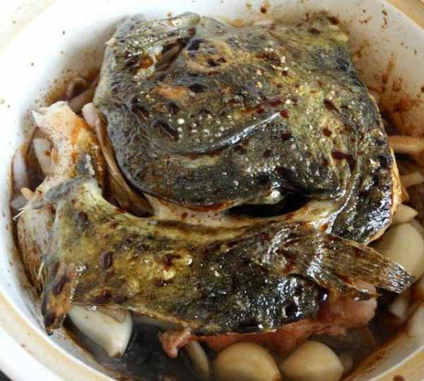 原料:碟魚頭、豬肉、香蒜、洋蔥、美極鮮、醬油、醋、蠔油、白砂糖、花生油、香菜。