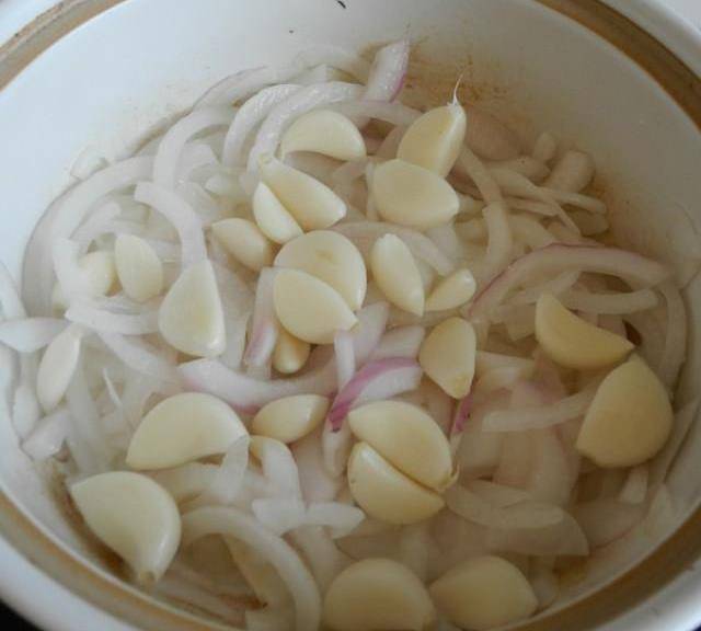 第7步、再在洋蔥上面撒上一層鮮蒜。