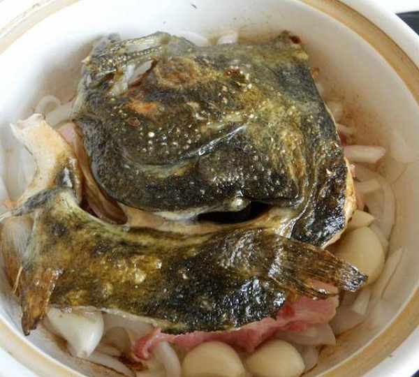 第9步、放上煎鍋的碟魚頭。