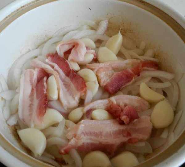 第8步、再在鮮蒜上面鋪上五花肉片。