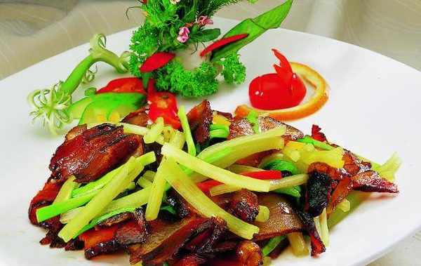 芹菜炒臘肉:將熟臘肉去皮,切成長方片;芹菜去葉,擇洗幹凈,切成段;將鍋架在火上,放油燒至七成熱,先下入臘肉片快速煸炒,邊炒邊淋少許鮮湯,炒出香味後烹入料酒,下入芹菜後再同炒幾下,見芹菜轉綠即放鹽和味精拌勻,出鍋裝盤即成。這道菜柔軟脆嫩,香濃味鮮。色香味俱全!