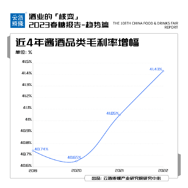 以醬酒產業數據推算,醬酒品類毛利率(總利潤/總銷售收入)2019年為40.74%,2020年為40.65%,2021年為41.05%,到2022年為41.43%,增長速度已明顯放緩。