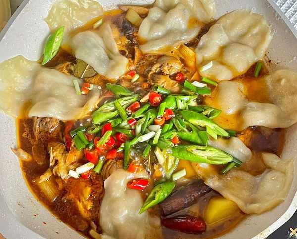 記得水量要比平時燉菜多加一些哈~到最後燜餅要觀察免得湯汁收幹瞭,愛吃辣點的可以多放點幹辣椒或者辣椒面調味