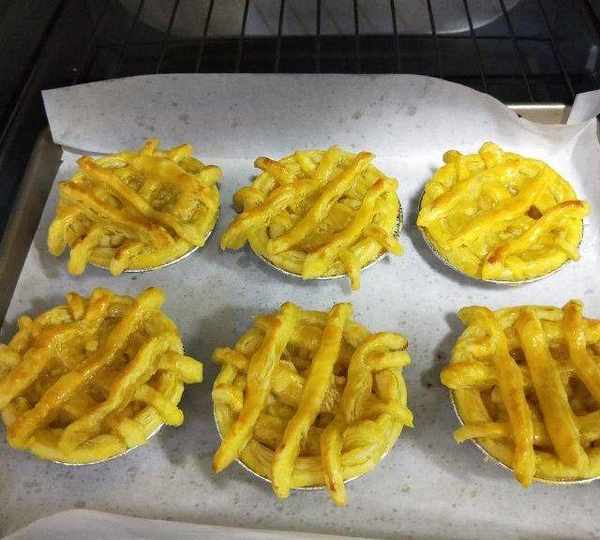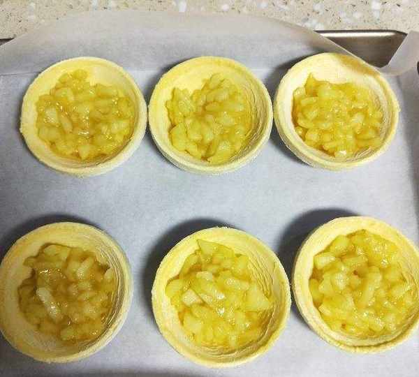 第10步、將炒好的蘋果餡放入蛋撻皮中。