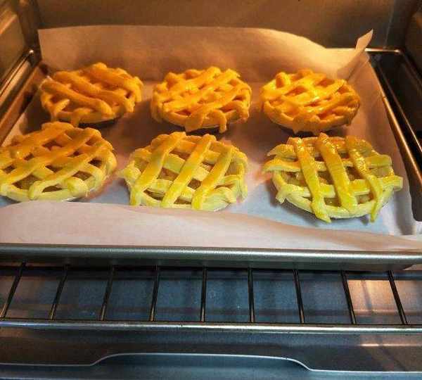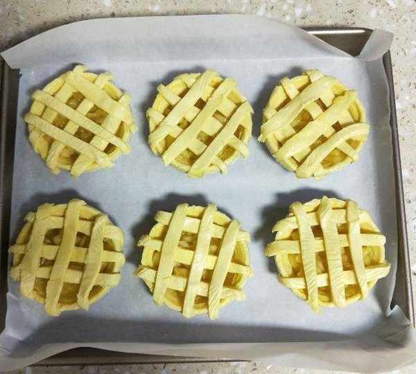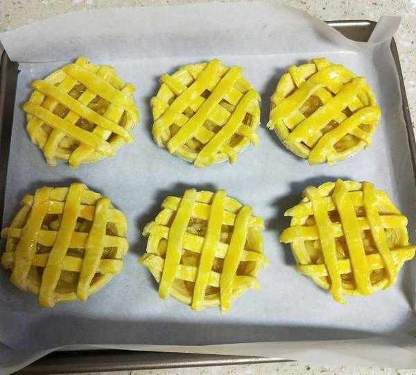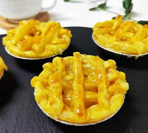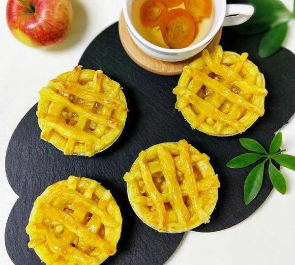 原料:蛋撻皮、小蘋果、蛋黃、糖、黃油、鹽、玉米淀粉、水。