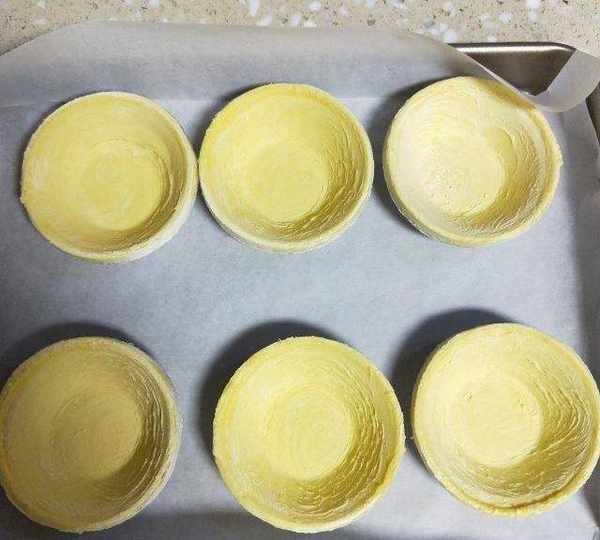 第9步、烤盤中準備六個蛋撻皮。