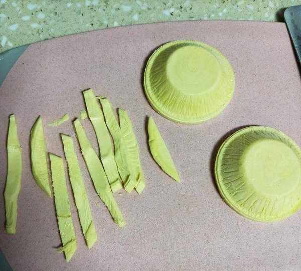 第11步、另外4個蛋撻皮軟化後切成細條。