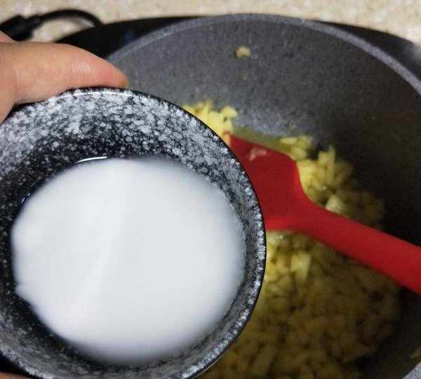 第7步、翻炒5分鐘後,倒入水淀粉。