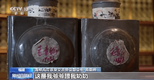 海峽兩岸茶業交流協會副會長 黃聖輝:這兩罐茶你看上面寫著老喜公、老喜媽,這是我爺爺跟我奶奶在我父親結婚的時候為他們封存的兩罐茶,當時也是希望父親把武夷巖茶的傳承做好,代代相傳。
