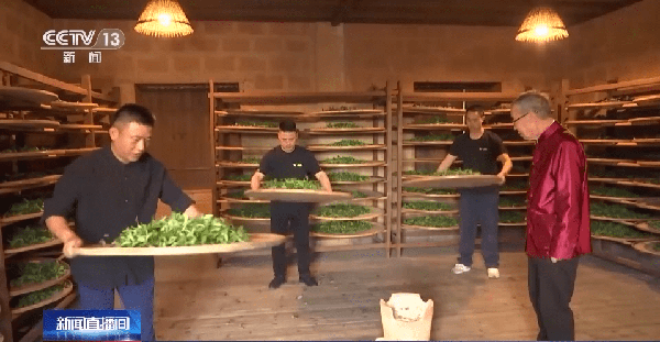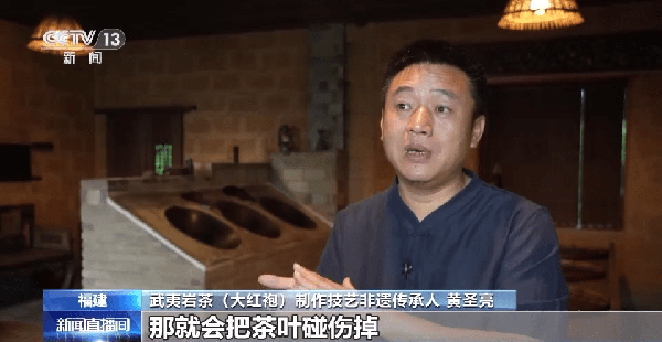 武夷巖茶(大紅袍)制作技藝非遺傳承人黃聖亮:我們整個在搖青的過程中是要搖到茶與茶之間產生碰撞,如果不是熟練的工人經常搖的時候就會茶葉與篩子產生碰撞,那就會把茶葉碰傷掉。