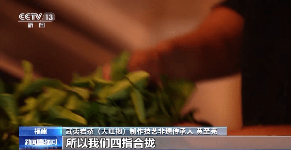武夷巖茶(大紅袍)制作技藝非遺傳承人黃聖亮:這炒的時候就很講究技巧瞭,我們在炒的時候需要手一伸下去就壓在茶葉上面,而不能貼在鍋,貼在鍋裡手就容易燙起泡,所以我們四指合攏不讓水蒸氣從手縫裡邊透過,控制它的熱度,然後手下去以後是貼在茶葉上把它整個翻轉過來。