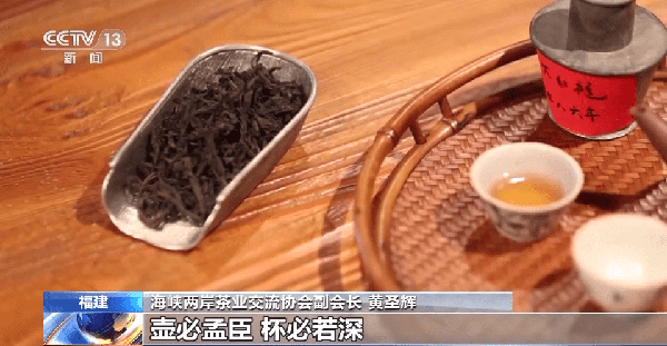 海峽兩岸茶業交流協會副會長 黃聖輝:在我們這裡以前流行的一句話叫“壺必孟臣,杯必若深,茗必武夷,三者為品茗之要”。茗必武夷講的就是武夷巖茶,然後泡的是功夫泡法,用的是紫砂壺,若深杯就是有一點凹下去,小小如櫻桃一樣的杯子,然後一口含在嘴裡,它整個茶的香味會在你的口腔裡循環的感覺,所以這三個配合在一起,它就是待客的最高禮儀。