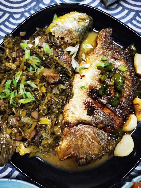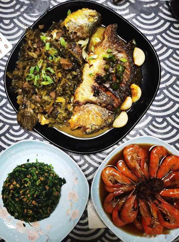 今日小滿,魚配蝦。大黃魚一分二,一半蒜子傢燒,一半雪菜香菇煨,加個話梅冰醉蝦,香油馬蘭頭