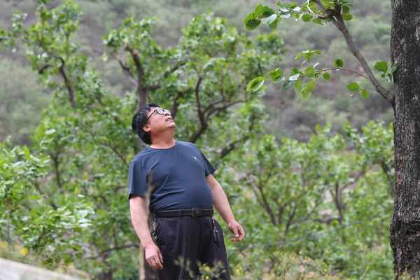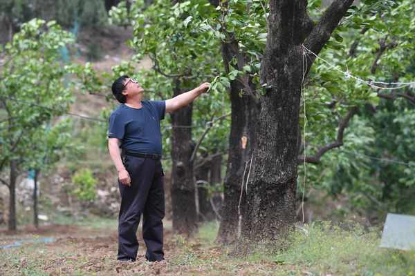 張坊鎮大峪溝村村民張進良查看嫁接的柿子樹。新京報記者 王穎 攝