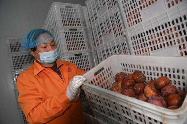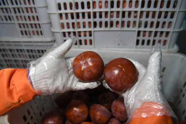 被制作成冰柿上市的磨盤柿,個頭大小和飽滿程度都有講究,郭冬梅說,磨盤柿必須達到500克重,外形表皮光滑無瑕疵,才能進到脫澀室,完成美味的再一次升華。