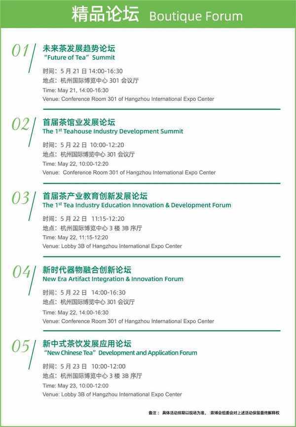 本屆茶博會將持續至5月24日,未來茶發展趨勢論壇、首屆茶館業發展論壇、新時代器物融合創新論壇、首屆茶產業教育創新發展論壇、新中式茶飲發展應用論壇等一系列論壇及品牌推介活動持續精彩呈現,不容錯過!