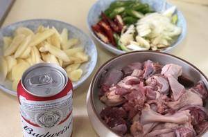 半隻鴨(買嫩鴨適合炒,我用的是紹興鴨,不要買老鴨,老鴨適合做湯,沒煮熟。),薑2片,啤酒2瓶,蔥薑適量和大蒜,都切塊備用。