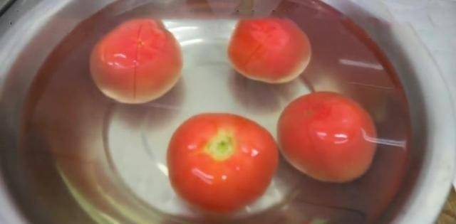 首先,我們準備四個西紅柿,在西紅柿表面劃十字刀,然後加入開水將西紅柿浸泡十分鐘。這是為瞭更好地剝去西紅柿的皮。十分鐘後,將西紅柿從鍋中取出並放入。鍋內加入冷水,西紅柿去皮,切成厚片待用