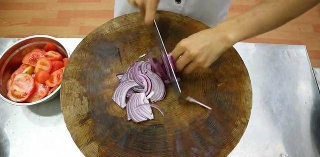 接下來就是開始準備輔料瞭,準備半個洋蔥切細條,西紅柿和洋蔥的比例是八比一,準備一小塊薑切成薄片待用,然後是切好的西紅柿倒入料理機攪拌均勻,攪拌的盡量稀,把攪拌好的番茄汁倒入碗中