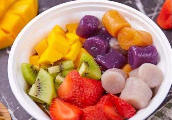 第六步:將冰塊放入制冰機,打碎成碎冰,鋪在碗裡,然後放上水果,再放上芋圓,最後淋上豆漿即可食用。