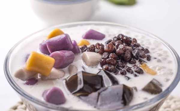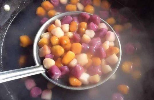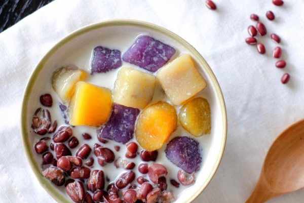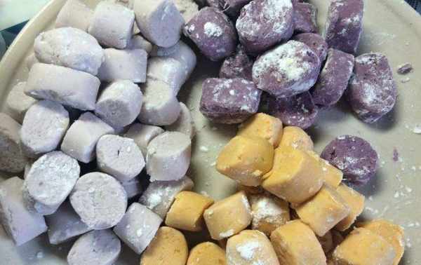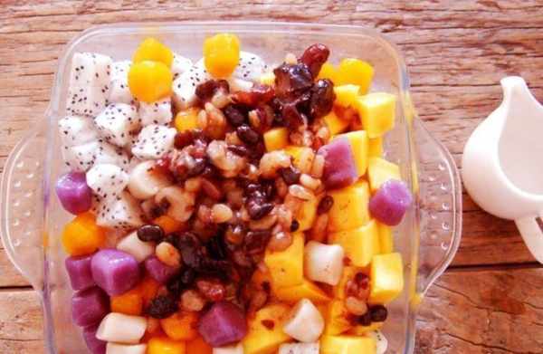 所需材料:南瓜、紫薯、芋頭、木薯粉、黃豆、紅豆、芒果、火龍果、牛奶、奶油、水、冰糖