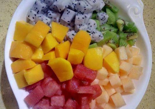 第五步:芒果去皮切小塊,火龍果去皮切小塊。(根據自己喜好放什麼水果)