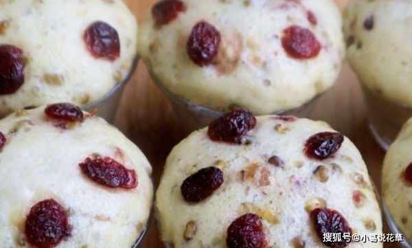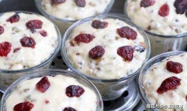 4.面團醒好後,倒入之前準備好的蔓越莓幹、葡萄幹和綠豆。這一步攪拌時,不要順著一個方向攪拌,攪拌均勻即可。5.準備幾個小烤盤,抹上一層油,然後把調好的面團放進去,用勺子把表面攤平,蒸鍋裡放冷水,這時候不要點火,蓋上蓋子,等待15分鐘。起床後,在每個碗中加入少許蔓越莓幹裝飾,水開後蓋上鍋蓋燜煮約25分鐘。時間到瞭,關掉暖氣,用文火燉5分鐘,然後再打開蓋子。尖端: