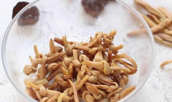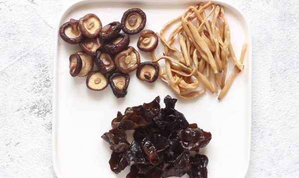 1、香菇、黑菇、黃花菜先用溫水泡軟,擠幹水備用,香菇水存放備用。