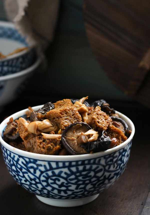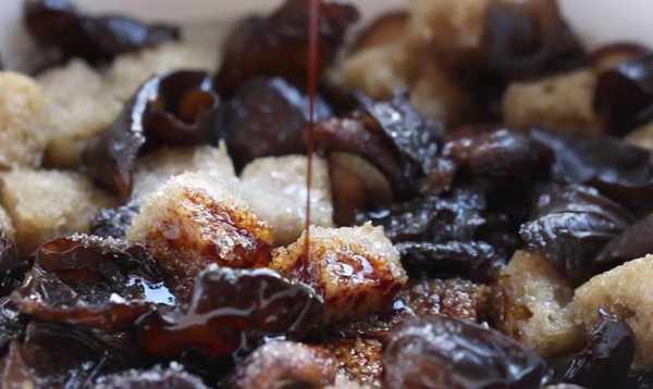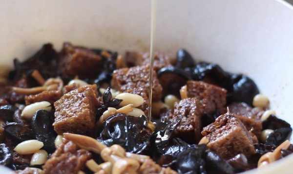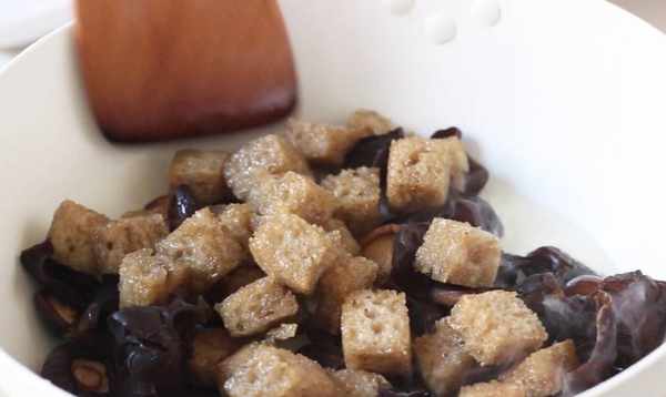 【小貼士】黃花菜泡水後比較結實,煮的時候不容易散開,味道更紮實。香菇選擇小珍珠菇,更香更入味。香菇洗凈後,泡發的水要留著備用。烤麩漂白後,用清水沖洗幹凈,擠幹水分,可以去除烤麩的酸味。傳統做法的烤麩,可以整塊用水焯一下,然後用手撕成小塊,這樣烤麩的表面積比較大,可以充分吸收汁液和味道。更好地煮。在這裡,將烤過的麩皮切成方塊,成品更加美觀。這裡的食物略帶甜味,因此請根據您的需要調整此食譜中的糖量。
