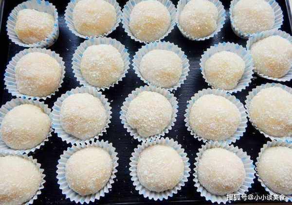 第五步:把包好的糯米球放在椰絲裡,滾一圈,讓糯米球上裹上一層椰絲。