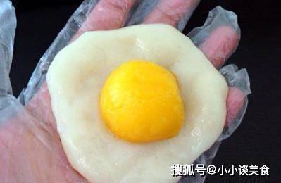 第四步:然後取適量芒果果肉放入糯米皮中,然後閉嘴揉捏,然後搟成圓形。