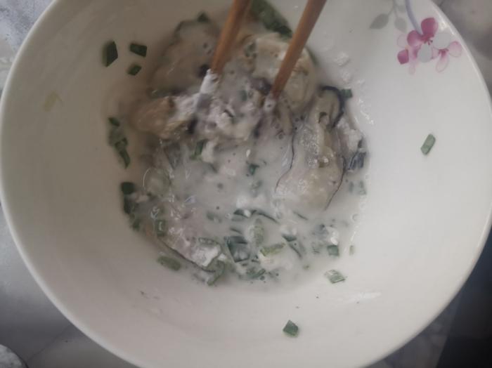 把買來的生蚝用刀子撬開,取生蚝肉,洗淨放到碗裏,加入小葱末,鹽適量,紅薯澱粉攪拌均勻。