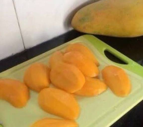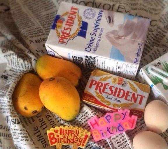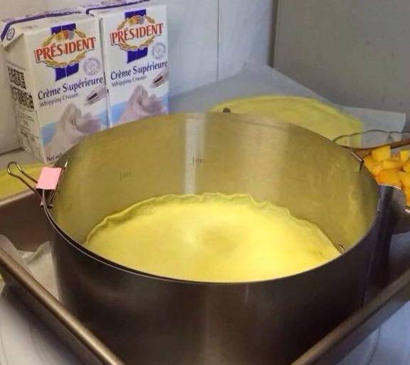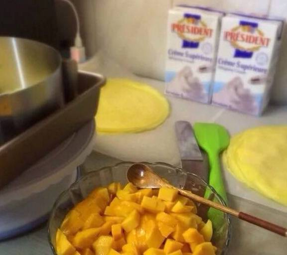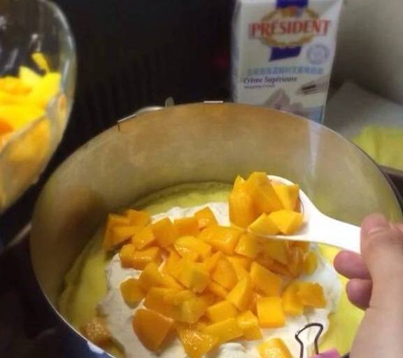 原料:低粉、牛奶、砂糖、雞蛋、黃油、芒果、砂糖、淡奶油。