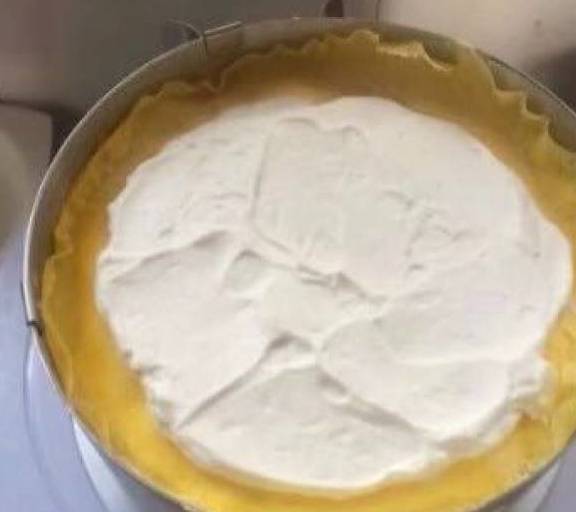 第11步、把冷藏好的蛋糕拿出來倒扣出模,把之前放入冰箱的淡奶油拿出來,從最邊擠上奶油,